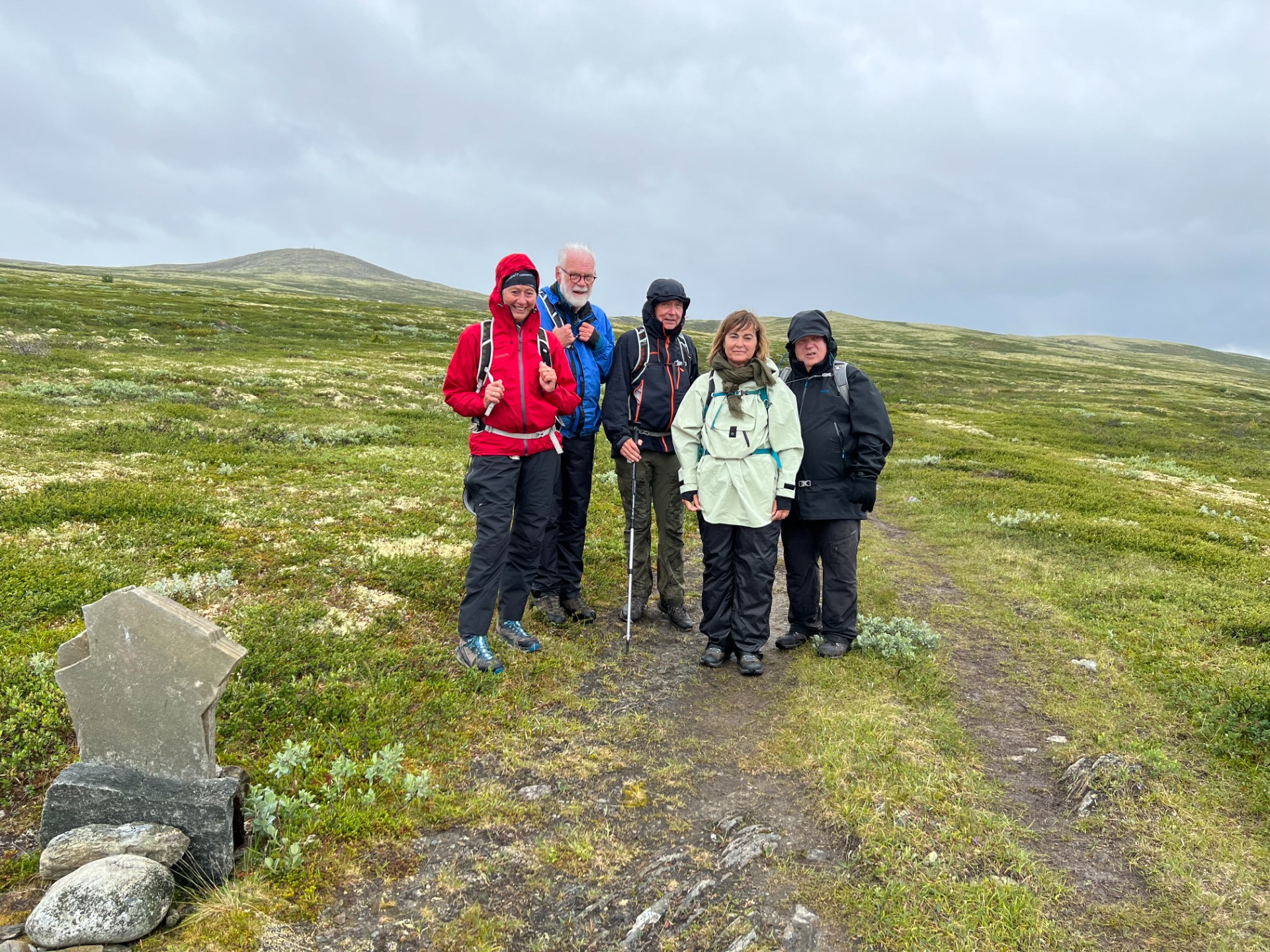 Frå parkeringa følgde vi vegen inn til Hjelle seter (for tida ikkje i drift). Derifrå gjekk stigen nordover. Det var litt vått på stigen og litt regn i lufta, men lett å gå. Etter kvart går denne stigen oppover, til den treffer på Kongevegen/pilegrimsleia (som kjem frå Fokstugu, som også kan vera eit utgangspunkt for denne turen). Herifrå følgde vi vegen sørover att, mot Budsjord.